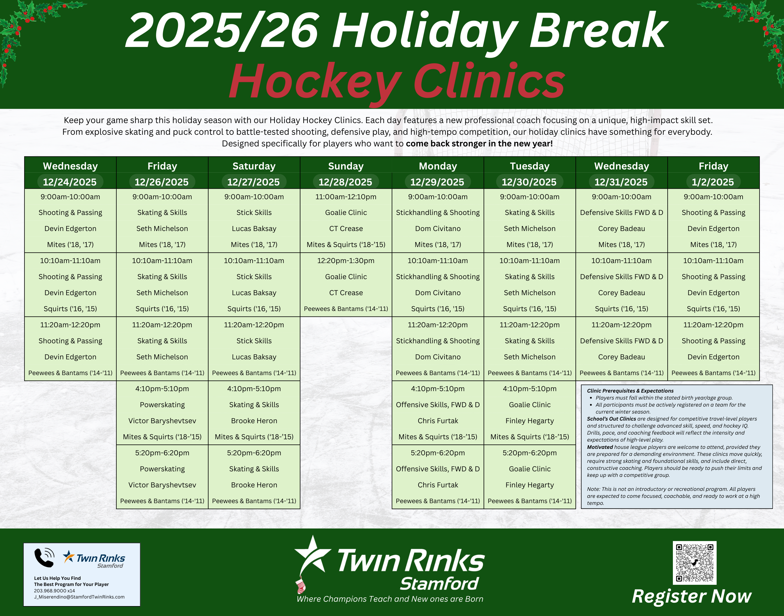 School’s Out Clinics provide an array of clinics from a variety of coaches ensuring all players have an opportunity to hone specific or fundamental skills. Take advantage of the day off from school and get the extra ice time you’ve been looking for. These clinics will fill up, register now!