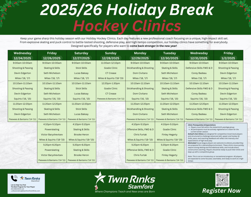 Motivated house league players are welcome to attend, provided they are prepared for a challenging environment. These clinics move quickly, require skating and foundational skills, and include direct, constructive coaching. Players should be ready to push their limits and keep up with a competitive group.