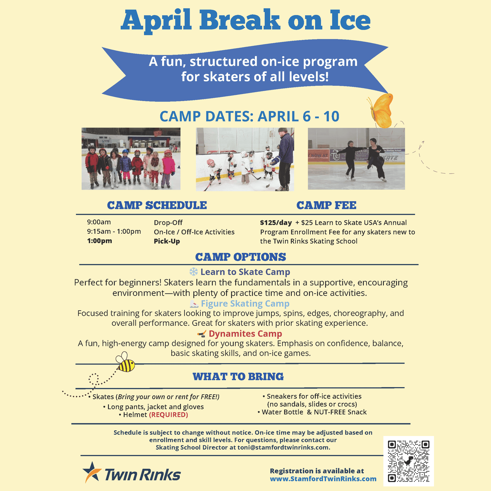 $125/day + $25 Learn to Skate USA Annual Program Enrollment Fee for any skaters new to the Twin Rinks Skating School’s 2025-2026 Season